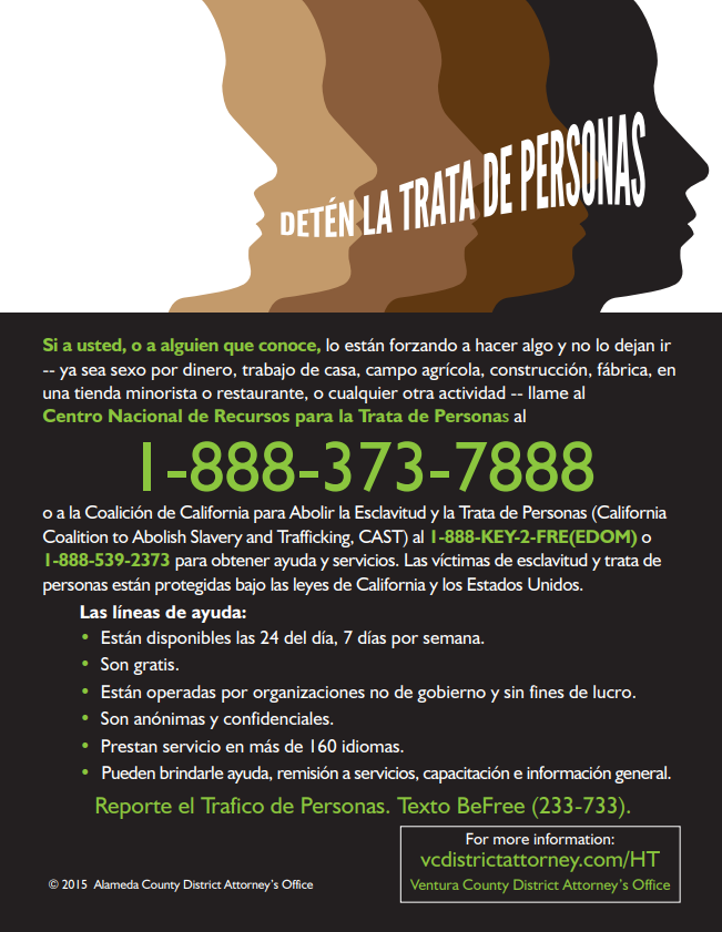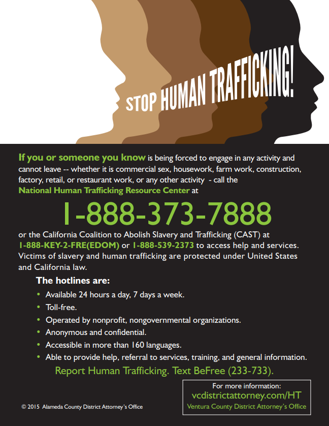 To report suspected human trafficking or to receive assistance call your local police department, the REACH Team at (805)261-1212, call the National Human Trafficking Resource Center at 1(888)373-7888, or text the National Human Trafficking Resource Center the word "HELP" or "INFO" to 233733.