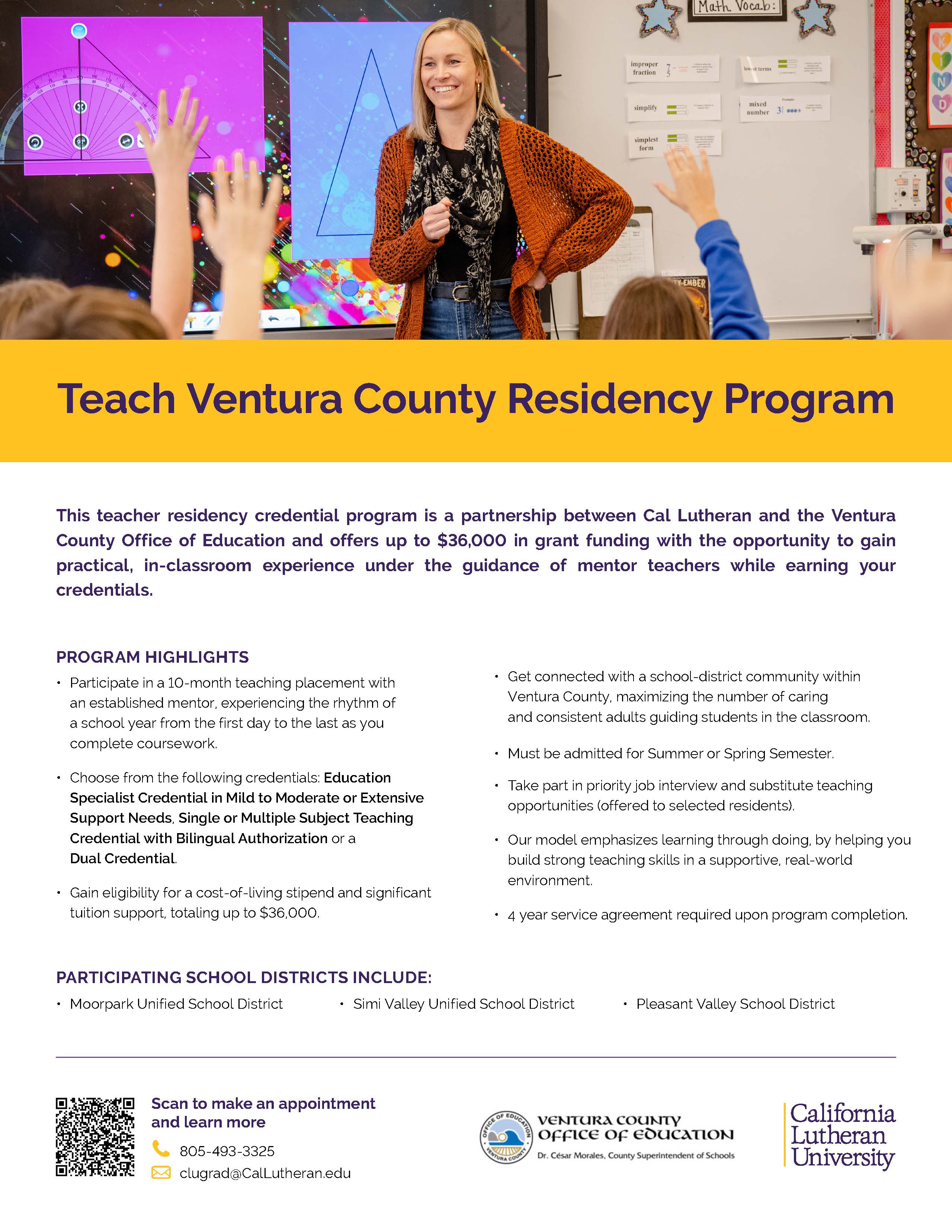 In collaboration with the Ventura County Office of Education, the Teach Ventura County residency program serves to expand the pool of qualified teachers in high-need areas through specialized training and support.