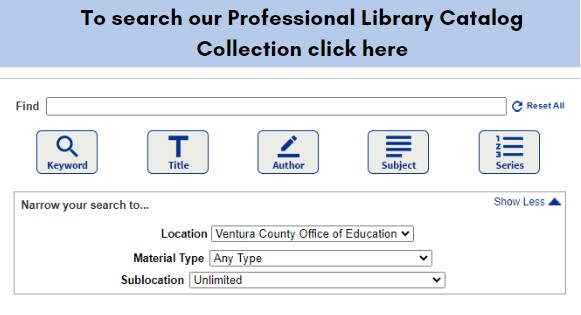 Note: Please contact Ashlee Nishiya at (805) 437-1340 or anishiya@vcoe.org to set up an appointment to visit the LRDC. Due to Librarian of Record services, staff is not always available on site.