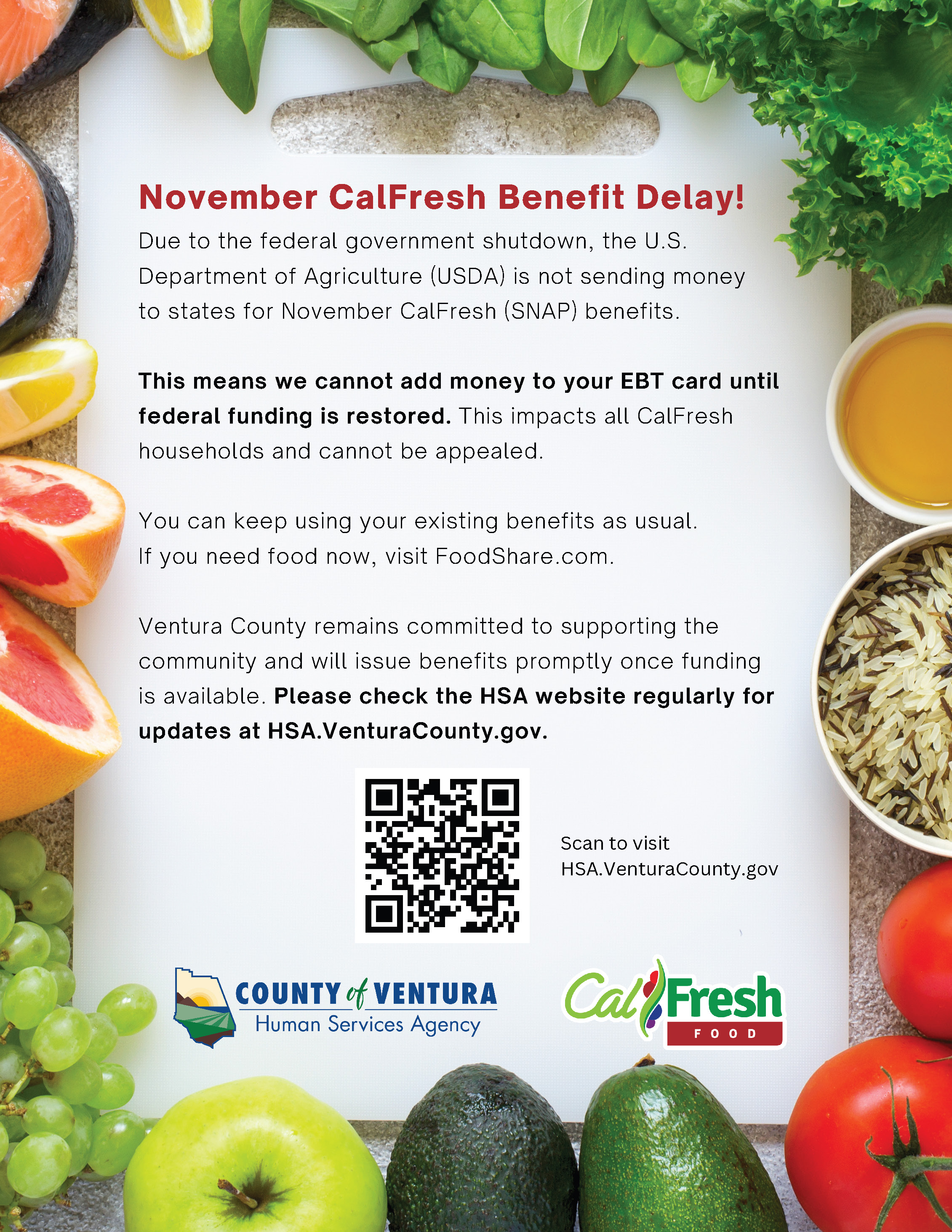 Due to the federal government shutdown, CalFresh benefits will be delayed beginning November 1, 2025. Information and resources for affected families are provided below. Please be aware that school meal programs are not impacted by the CalFresh funding delays and will continue to operate normally.